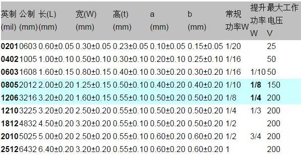| 英制(mil) | 公制(mm) | 额定功率@ 70°C | 峰值工作电压(V) |